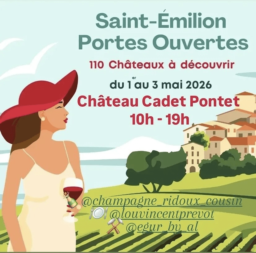 Nous sommes ravis de vous annoncer notre présence aux Portes Ouvertes de Saint-Émilion, du 1er au 3 mai 2026, au Château Cadet Pontet.